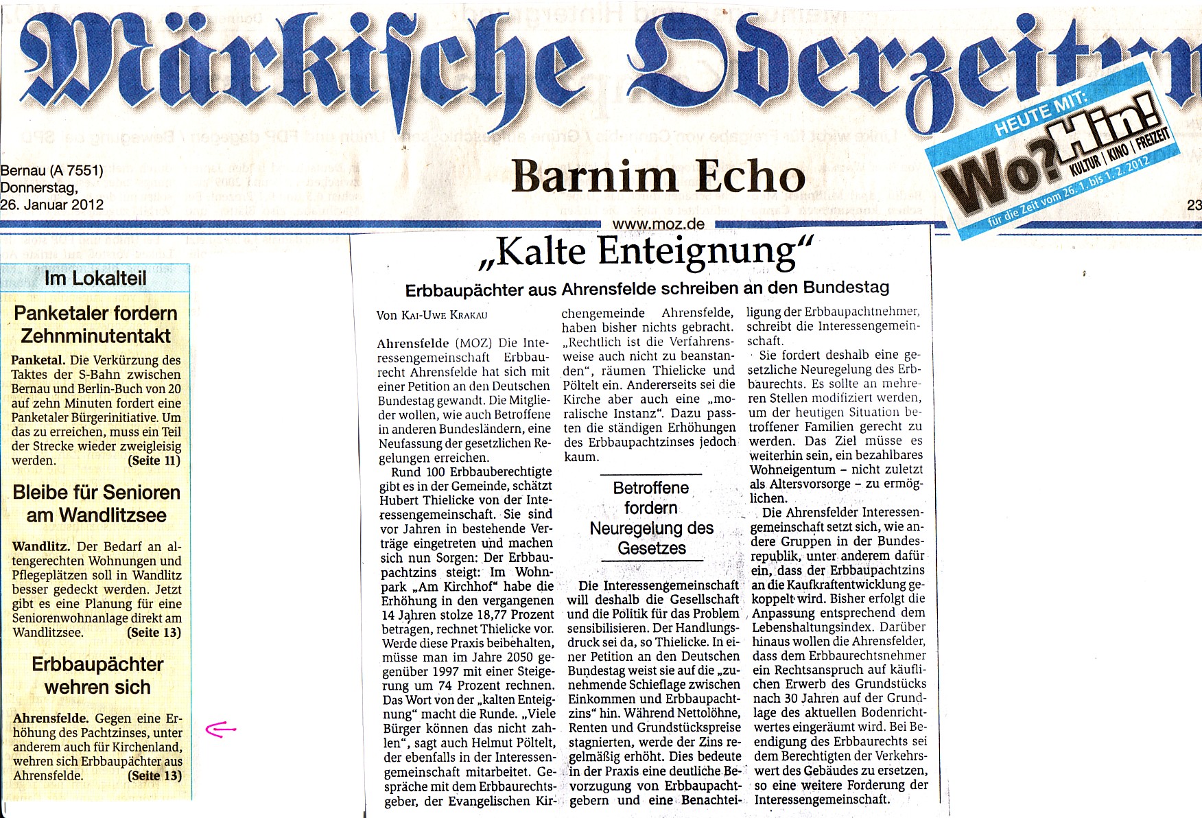 Märkische Oderzeitung Bernau, 26.01.2012, Kalte Enteignung – Erbbaupächter schreiben an den Bundestag